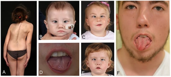 Spectrum of Moebius syndrome features. (A) Scoliosis. (B) Expressionless face, esotropia, epicanthic folds feeding difficulties (tube fed). (C) Bilateral VI palsy, unilateral VII palsy. (D) Rugose hypoplastic tongue. (E) Characteristic expressionless face, epicanthic folds, short upper lip bilateral VI palsy (esotropia) and bilateral VII (facial) palsy. (F) Rugose tongue, bilateral VI and VII palsy following strabismus surgery.