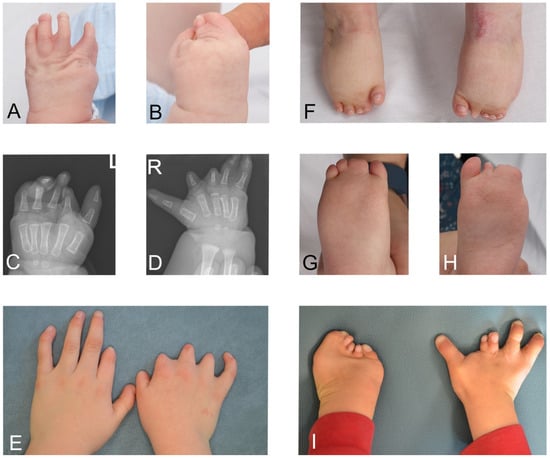 Limb anomalies in Moebius syndrome. (A–D) Photo and radiographs of right and left hands of patient with bilateral symbrachydactyly. (E) Bilateral symbrachydactyly. (F–H) Hypoplastic toes, talipes and syndactyly of feet. (I) Bilateral complicated symbrachydactyly.