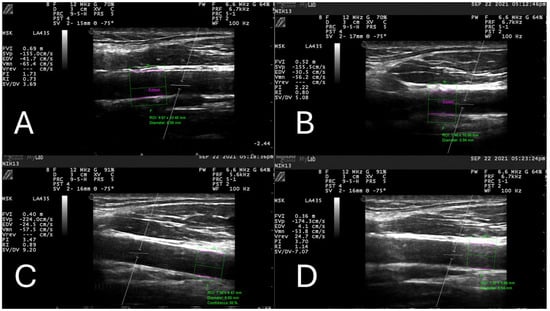 Representative ultrasound images and common carotid artery (CCA) diameter measurements of one subject during resting (A) and low-intensity (B), moderate-intensity (C), and high-intensity (D) exercise conditions. In all 4 images, the green dotted squares represent the region of interest (ROI), where the edge detection software (Vascular Research Tools, Medical Imaging Applications LLC, Coralville, IA, USA) identifies the edges of the CCA represented by the purple lines and measures the vessel’s diameter (values written in green letters).
