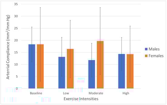 Common carotid arterial compliance by exercise intensity and sex. Data show means and standard deviations (n = 10/group).