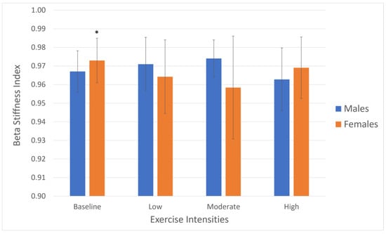 Common carotid artery beta stiffness index by exercise intensity and sex. Data show means and standard deviations (n = 10/group). * p < 0.05 baseline vs. moderate (females).