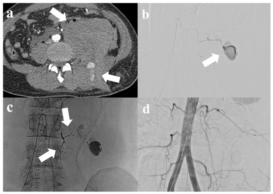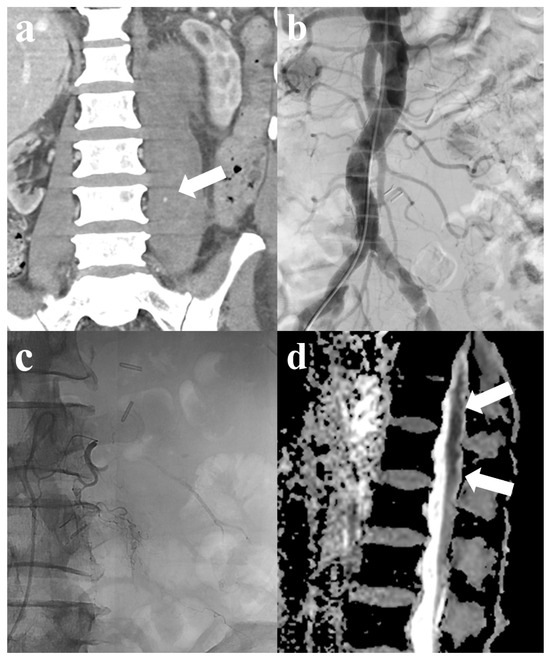- Grigoriadis, S.; Georgiadi, E.; Sidiropoulos, T.A.; Efthimiou, E.; Spiliopoulos, S. Spinal Cord Ischemia after Lumbar Artery Embolization for Retroperitoneal Hemorrhage. J. Vasc. Interv. Radiol. JVIR 2024, 35, 329–330. [Google Scholar] [CrossRef] [PubMed]