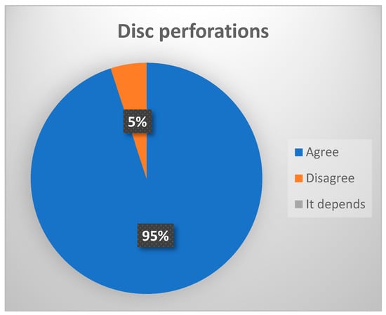 - Disc perforations: These are most often seen at the junction between the retrodiscal area and the joint meniscus, and are usually related to cases of advanced osteoarthrosis [,]. (Consensus, 95% of votes agree (Figure 5).)