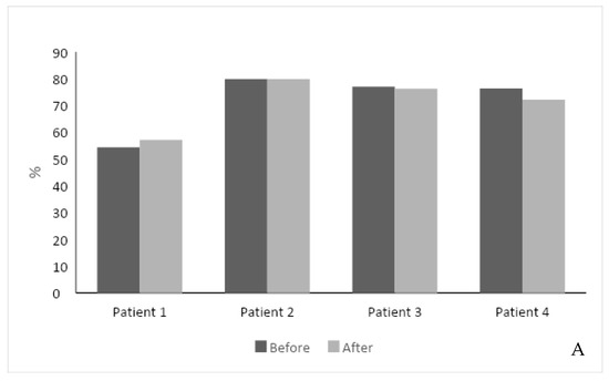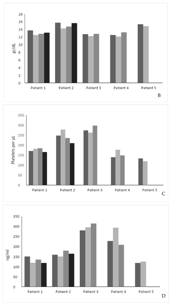 The hemoglobin level was stable in four patients and increased by 0.7 in one patient (Figure 1B). The median hemoglobin level was 13.7 g/dL before and 13.2 g/dL after the study intervention (p = NS). Platelet level increased in two patients, decreased in two patients, and was stable in one. The median platelet level was 170 × 109/L before and 165 × 109/L after the study intervention (p = 0.81) (Figure 1C).