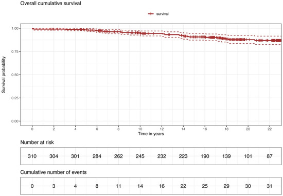 The mean follow-up time was 16.3 ± 6.3 years. In-hospital mortality was 0.64% (n = 2), 6-month mortality was 0.97% (n = 3), and 1-year mortality was 0.97% (n = 3). We report a 5-year and 10-year mortality of 1.3% and 5.7%. Kaplan–Meier curve portrays the overall survival of our cohort (Figure 1).