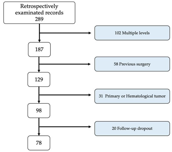 All patients accessing symptomatic vertebral metastases at our institution within the designated time frame were regarded as potential candidates for this study. The inclusion criteria encompassed the presence of a singular vertebral metastasis, a SINS score equal to or surpassing 7, a minimum follow-up period of 6 months, the comprehensive availability of clinical and radiographic records, an age above 18 years, and a life expectancy surpassing 6 months. The criteria for exclusion involved primary spinal tumors, prior spinal interventions, hematopoietic system tumors (myelomas, lymphomas), and the manifestation of neurological deficits. Patients who required decompression were excluded from this study to allow us to focus on cases that were suitable for stabilization procedures alone. Patients were categorized into two groups based on the received treatment: the open posterior fusion (OPF) group and the percutaneous osteosynthesis (PO) group. As this was a retrospective study, no randomization or specific choice of treatment type was performed. The criterion was purely temporal and dictated by the availability of the specific instruments and the radiolucent table in the operating room. Essentially, until 2018, we treated almost all patients with the OPF technique, while from 2019, we began using PO, resorting to the OPF technique only in cases where the radiolucent table or the necessary instruments were unavailable. A total of 289 patients were initially evaluated for inclusion in the study. The process of inclusion and exclusion is detailed in Figure 1. Briefly, patients were excluded for having multiple levels of disease (n = 102), previous surgeries (n = 58), primary tumors (n = 31), and follow-up dropout (n = 20). This resulted in a final cohort of 78 patients being included in the analysis. However, in Table 1 and Table 2, which concern the clinical data of the patients before dropout, the data of the entire cohort of 98 patients are reported; the statistical analysis of clinical and functional outcomes instead only considers the data of the 78 patients who were followed up.