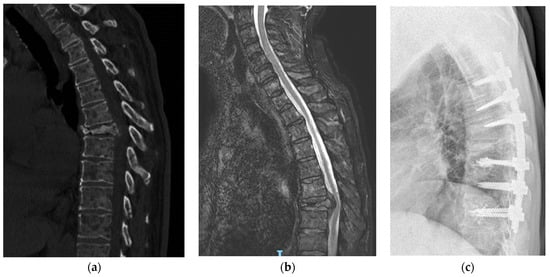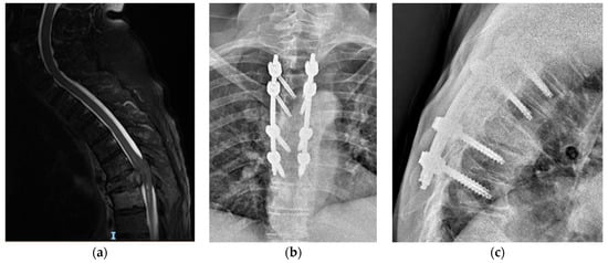 For the PO, the procedure began with the percutaneous placement of pedicle screws, using standard C-arm fluoroscopy to obtain anteroposterior and lateral projections. A four-handed technique was employed for surgery. Small incisions were made over the pedicles under fluoroscopic guidance. The entry point was then identified, and a trocar was inserted. Pedicle screws were inserted percutaneously using guide wires. Vertebral stabilization was completed with two titanium rods, which were appropriately contoured and inserted using specialized instruments. A layered closure was performed. An illustrative case of a patient treated with this technique is reported in Figure 3.