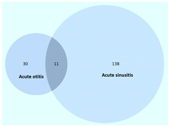 Increased white blood cell counts were seen in 50.8% of patients, especially in those with AO (p = 0.009, Table 2). Increased C-reactive protein values were observed in 74.3% of the cases, also with a higher frequency in patients with AO (83.3%) or those with both otitis and sinusitis (81.8%).