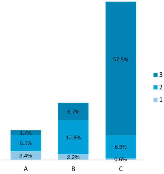 The majority of patients with HIV infection were classified as stage C3 (n = 103, 57.5%), followed by stages B2 (n = 23, 12.8%) and C2 (n = 16, 8.9%), Figure 2. Median CD4 values at admission were 508 cells/mm3 (IQR: 246, 761 cells/mm3), and 95.5% of the patients (n = 171) were under antiretroviral treatment. HIV viral load was available in a total of 73 (40.8%) patients. Of these, 39.7% (n = 29) were undetectable, 26.0% (n = 19) had HIV RNA detected but <200 copies/mL, 9.6% (n = 7) had HIV RNA between 200 and 1000 copies/mL and 24.7% (n = 18) had HIV RNA >1000 copies/mL. Also, 39.7% (n = 71) had at least one associated chronic condition, the most common being chronic hepatitis B (n = 23, 12.8%), cardiovascular disease (n = 21, 11.7%), a recent history of or current tuberculosis (n = 13, 7.3%), obesity (n = 10, 5.6%) and neurological disease (n = 9, 5.0%).