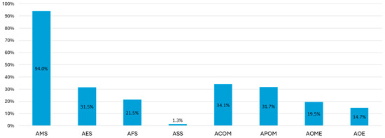 Frequency of types of acute sinusitis and otitis. The percentages have been calculated by taking as the denominator the total number of cases of AS and AO, as shown in the text. AMS—acute maxillary sinusitis, AES—acute ethmoid sinusitis, AFS—acute frontal sinusitis, ASS—acute sphenoid sinusitis, ACOM—acute congestive otitis media, APOM—acute purulent otitis media, AOME—acute otitis media with effusion, and AOE—acute otitis externa.