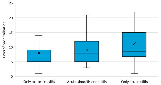 Median length of hospital stay was 7 days (IQR: 5, 10 days), significantly higher in patients with AO (8.5 days (IQR: 7, 15 days)) compared to those with AS (7 days (IQR: 5, 9 days)), p = 0.016 and H = 8.318, Figure 4. Complications such as tympanic perforation (n = 12 cases), meningitis (n = 2 cases), cavernous sinus thrombosis (n = 1 case) and mastoiditis (n = 1 case) were documented in 8.9% (n = 16) of cases.