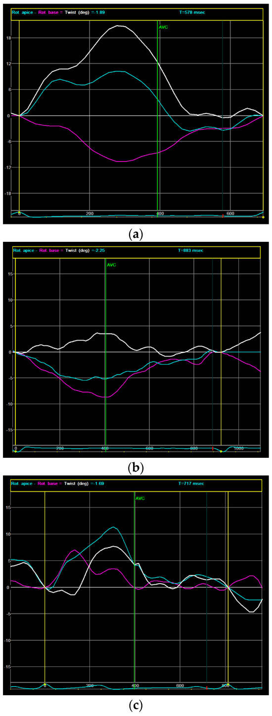For every echocardiographic study, we calculated the GLS, and the peak systolic LV twisting was calculated as the maximum instantaneous difference between peak systolic apical and basal rotation. An RBR pattern was defined as the loss of opposite rotation between the LV base and LV apex [11]. Figure 1 shows three speckle-tracking analyses of the LV twisting: a normal pattern (Figure 1a), an RBR pattern due to reversed apical rotation (Figure 1b), and an RBR pattern due to reversed basal rotation (Figure 1c).