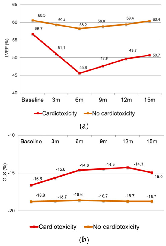 On the other hand, early cardiotoxicity detection and its prompt treatment seem to be crucial for a major improvement in cardiac function [11]. Guerra et al. showed that GLS ≥ −16 at 3 months was able to predict which patient would have a significant LVEF reduction at 6 or 9 months [16]. According to Thavendiranathan et al., the thresholds of change in GLS to predict cardiotoxicity range from 10% to 15% using speckle tracking [8].