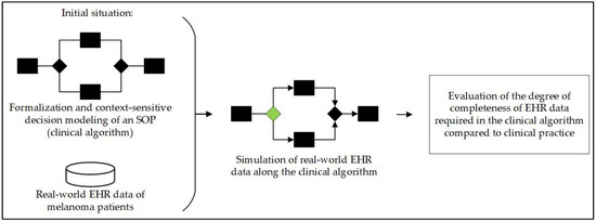 First, we verify the algorithm with defined patient datasets from the Smart Hospital Information Platform (SHIP) [19] (p. 294) by simulating them along a modeled clinical algorithm with defined decision points to see if the data that are needed are available. After verification, the data required at the decision points within the algorithm are evaluated by dermatooncologists along the question of how complete it is and where we find discrepancies between the clinical algorithm and clinical practice. Thus, we aim to answer the following two research questions (RQ):