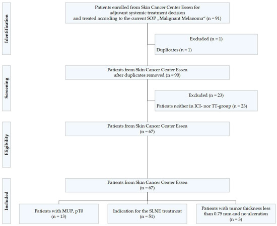 Patient flow chart. ICI = immune checkpoint inhibition; TT = targeted therapy; MUP = melanoma of unknown primary; SLNE = sentinel lymph node excision; SOP = standard operating procedure.