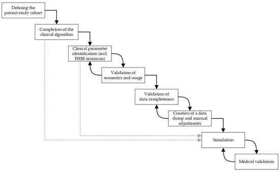 Subsequently, we asked a team of experts to perform a medical validation (Figure 3). First, all identified FHIR resources and their fields were validated by a computer scientist of the SHIP team, a dermatooncologist, and a tumor records technician for correct semantics and usage. Second, the completeness of the anonymized patient data was validated using real-world patient data from [26]. An anonymized data dump from SHIP was acquired for manual adjustments resulting from deviations due to unstructured data. Based on the completed clinical algorithm and the validated parameters required for the decision points, the step-by-step simulation was executed along the clinical algorithm using the defined patient cohort. A dermatooncologist evaluated the simulation results by comparing the results with those of guideline-based recommendations for the treatment of stage III melanoma.