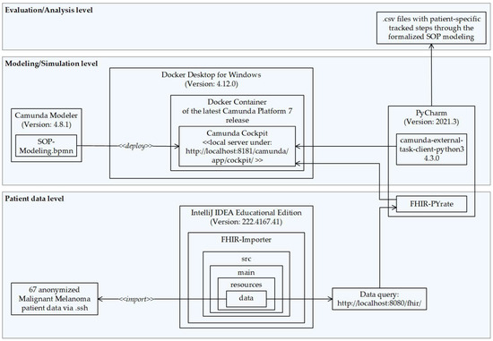 The simulation engine comprised a standard HAPI FHIR server (Apache license version: 2.0, January 2004) using IntelliJ IDEA Educational Edition (version: 222.4167.41); a Camunda Docker container (server version name: Apache Tomcat/9.0.58) and a Camunda Modeler (exporter version: 4.8.1, execution platform: Camunda Platform, execution platform version: 7.15.0), which provided the BPMN model that was deployed on the Camunda Cockpit application (Camunda platform version: 7.18.0). This was all orchestrated by a Python script (using PyCharm version: 2021.3). FHIR data were queried using the FHIR-PYrate package [28]. An overview of the framework is illustrated in Figure 4.