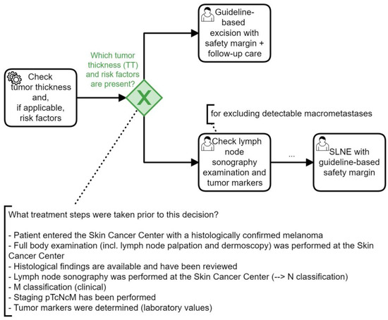 We chose malignant melanoma as our clinical use case because a long-term cohort of 3429 patients with melanoma was available (as of 23 October 2023) in the FHIR-based SHIP data platform. We also had a validated clinical algorithm of a hospital-specific SOP that was previously modeled in BPMN [20] with semantically integrated patient FHIR data [21]. We reduced our cohort to those patients with melanoma who had an indication for a sentinel lymph node excision (SLNE), since there is a clear indication for sentinel biopsy/excision within a German clinical practice guideline and a hospital-specific SOP, guided by a standardized treatment process. SLNE is a diagnostic surgical procedure used to classify the specific stage of a tumor according to the AJCC 8th edition [22] and is currently the subject of intensive clinical research [23,24]. Patients with certain risk factors [20,25] undergo an SLNE and adjuvant therapy is offered for one year if the results are positive.