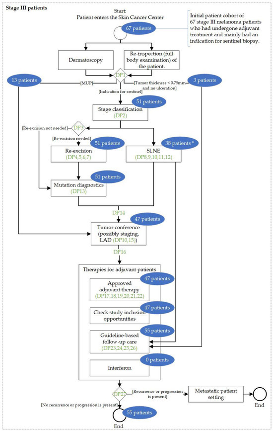 Simulation Characteristics: The simulation successfully represented the clinical algorithm for all 67 patients, allowing for retrospective analysis. However, twelve patients (see Figure 6, *) could not be fully represented by the clinical algorithm due to the need for highly individualized treatment. This was realized in the clinical algorithm using a preliminary end event. From the clinical algorithm, we identified a total of 27 decision points that a melanoma patient with indication for SLNE might encounter during medical treatment (see Table 2).