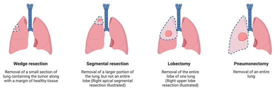 Most thoracic cancer centers worldwide adopt standard treatment using surgery, radiation, chemotherapy, and palliative care. Surgical treatment plays a key role in managing early stage NSCLC, with an overall survival (OS) of 90% [7]. Surgical approaches for lung cancer may be divided based on the approaches to the surgery and how much lung is excised. Approaches to lung cancer surgery include video-assisted thoracoscopic surgery (VATS), robotic-assisted thoracoscopic surgery (RATS), or traditional open surgery. Resection of the lung is performed as either a wedge resection, segmentectomy, lobectomy, or pneumonectomy (Figure 1). Some specialized centers also utilize emerging treatments such as immunotherapy, targeted therapy, and radiofrequency ablation.