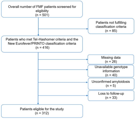 An amount of 189 out of a total of 501 screened patients were not included in the study due to not fulfilling the classification criteria, loss to follow-up, missing clinical data, or unavailability of genotype information or unconfirmed amyloidosis (Figure 1). Of 312 study participants, 63% (n = 196) were women and 36.8% (n = 115) were men. The mean age (standard deviation (SD)) of the population was 34 (11.7). The mean age of disease onset was 14 (9.71) years, whereas the mean age at diagnosis was 26 (12.9) years. Sixty-one percent (n = 193) of the patients had a family history of FMF, and 6.7% (n = 21) had a family history of amyloidosis.