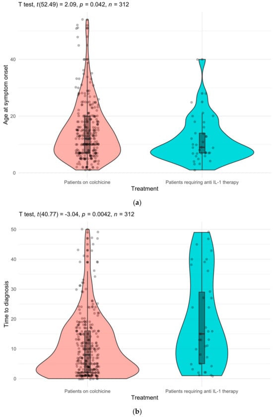 A Welch two-sample t-test revealed a statistically significant difference, indicating that the mean age at symptom onset in patients who required IL-1i treatment was lower (11.5 ± 8) compared to patients who did not need IL-1i treatment (14.5 ± 10), (p = 0.042) (Figure 2a). We also observed a longer delay from symptom onset to diagnosis in patients requiring IL-1i treatment (18.9 ± 15.4) compared to patients who did not (11 ± 10.6), (p = 0.004) (Figure 2b). The frequencies of disease manifestations did not show significant differences between the two groups.