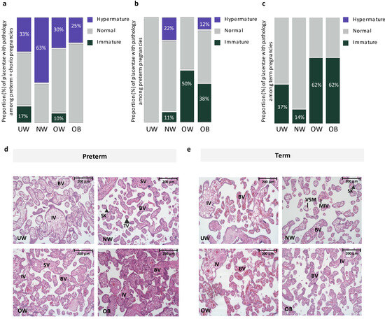 (a). Proportion of placentae with immature, normal, and hypermature placentae across BMI and gestational age groups among preterm pregnancies with chorioamnionitis. Placental hypermaturity was more prevalent in normal-weight pregnancies, representing a 150% and 400% increase in proportion of placentae that were hypermature in NW pregnancies, compared to UW and OW pregnancies, respectively. (b). Proportion of placentae with immature, normal, and hypermature placentae across BMI and gestational age groups among preterm pregnancies without chorioamnionitis. Placental immaturity was more prevalent in OW and OB pregnancies, representing a 300% and 200% increase in proportion of placentae that were immature in OW and OB, respectively, compared to NW pregnancies. (c). Proportion of placentae with immature, normal, and hypermature placentae across BMI and gestational age groups among term pregnancies. At term, placental immaturity was more prevalent in OW and OB pregnancies, representing a 400% increase in proportion of placentae that were immature in both OW and OB, compared to NW pregnancies. No hypermaturity was observed in term placentae. (d). Representative images from H&E-stained placentae from UW, NW, OW and OB preterm pregnancies. UW, OW, OB = immature pathology. BV = Blood vessel, IV = immature villus, TV (large arrowhead) = terminal villus, VSM = Vasculo-syncytial membrane, SK (small arrowhead) = Syncytial knot, SV = Stem villus. 20× Magnification. Scale bar = 200 μm. (e). Representative images from H&E-stained placentae from UW, NW, OW and OB term pregnancies. UW, OW, OB = immature pathology. BV = Blood vessel, IV = immature villus, MIV = mature intermediate villus, VSM = Vasculo-syncytial membrane, SK (large arrowhead) = Syncytial knot. 20× Magnification. Scale bar = 200 μm.