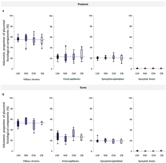 Volumetric proportion of placental histological components (%), including, from left to right, villous stroma, fetal capillaries, syncytiotrophoblast, and syncytial knots across maternal BMI groups among (a). preterm and (b). term pregnancies. Data are quantile box plots with a horizontal line representing the mean across the whole cohort.