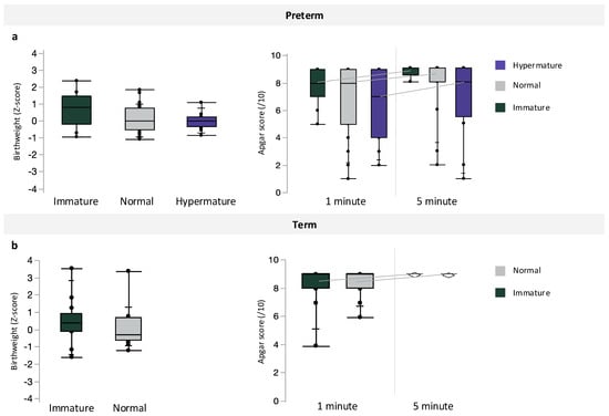 Associations between placental maturity (immature, normal, and hypermature) and birthweight z-scores or Apgar scores at 1 and 5 min among (a) preterm and (b) term pregnancies. Data are quantile box plots.