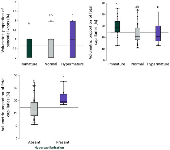 Volumetric proportion of syncytial knots or fetal vascular endothelium stratified by placental maturity (immature, normal, and hypermature) or placental hypercapillarisation. Data are quantile box plots with a horizontal line representing the mean across the whole cohort. Differences between groups are denoted by different lowercase letters.