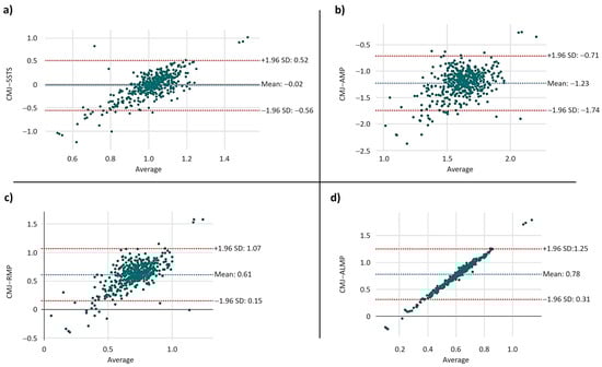 Figure 1. Bland–Altman plots between countermovement jump (CMJ) and (a) 5-time sit-to-stand (5STS) performance; (b) absolute muscle power (AMP); (c) relative muscle power (RMP); (d) allometric muscle power (ALMP).