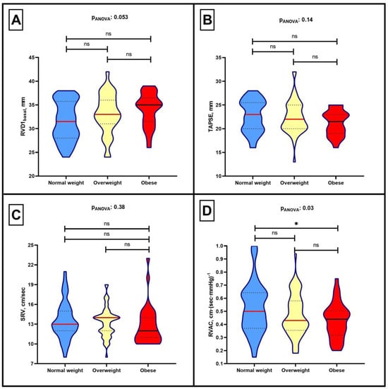 Violin plots demonstrating the differences according to body mass index categories in (A) maximum transverse diameter in the basal third of the right ventricle at end-diastole (RVD1), (B) tricuspid annular plane systolic excursion (TAPSE), (C) peak systolic velocity of the tricuspid annulus (SRV), and (D) right ventricular-arterial coupling (RVAC). *: signifies p < 0.05, ns = not significant.