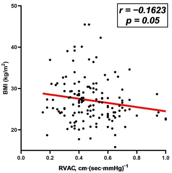 We next examined the association between BMI categories and the echocardiographic indices of right ventricular function and RVAC (Supplementary Table S1). RVD1basal exhibited a stepwise increase according to BMI categories (normal weight: 31.6 (4.1) mm vs. overweight: 33.1 (4.3) mm vs. obese: 34.0 (3.5) mm, p = 0.053), (Figure 1, Panel A). However, there were no differences in PASP (normal weight: 28 (8) mmHg vs. overweight: 30 (8) mmHg vs. obese: 32 (9) mmHg, p = 0.14) or markers of right ventricular systolic function based on BMI (for TAPSE: normal weight: 22.6 (3.4) mm vs. overweight: 22.4 (3.5) mm vs. obese: 21.2 (2.6), p = 0.14) and (for SRV: normal weight: 13.5 (2.8) cm/sec vs. overweight: 13.2 (2.3) cm/sec vs. obese: 12.7 (2.9), p = 0.38) (Figure 1, Panels B–D). When examining the differences in RVAC, we noted a stepwise decrease across the BMI groups (normal weight: 0.52 (0.19) cm·(sec·mmHg)−1 vs. overweight: 0.47 (0.16) cm·(sec·mmHg)−1 vs. obese: 0.43 (0.14) cm·(sec·mmHg)−1, p = 0.03) (Figure 1, Panel D). Moreover, we observed a significant correlation between BMI and RVAC (r = −0.16, p = 0.05) (Figure 2). Importantly, even after adjustment for confounders (age, sex, systolic blood pressure, diastolic blood pressure, left ventricular ejection fraction, intraventricular thickness, left ventricular mass index, left atrial diameter index and the ratio of E/e’) in the multivariate regression analysis (Table 3), obesity remained associated with lower RVAC (β: −0.085, 95% confidence interval: −0.163, −0.009, p = 0.029).
