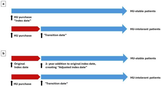 Definition of adjusted index date for the HU-stable group. (a) Timepoint of index date for HU-stable patients and timepoint of transition date for HU-intolerant patients. (b) Timepoint of adjusted index date for HU-stable patients.