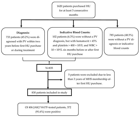 A total of 1620 patients who purchased HU for at least three consecutive months were identified, of whom 785 did not have a PV diagnosis or PV-indicating blood counts. Of the remaining 835 patients, 733 (88%) had a diagnosis of PV and an additional 102 (12%) patients had blood counts indicative of PV (with no documented PV diagnosis). Five patients (0.6%) were excluded due to less than 3-year continuous membership in MHS after the index date. Thus, 830 patients remained in the study (Figure 2). Among 406 patients who underwent JAK2 V617F mutational analysis (48.9% of total study patients), 372 (91.6%) were positive (JAK2 V617F testing began in 2007). The annual incidence of PV patients requiring HU treatment during the study period was 2.37 to 5.94 per 100,000 patients.