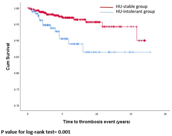 The venous thrombosis rate was 1.58 vs. 0.47 per 100 PY for HU-intolerant and HU-stable patients, respectively (p < 0.001) (Figure 3).
