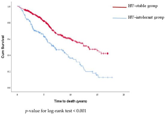 Death occurred in 58% of HU-intolerant patients vs. 30% of HU-stable patients. The mortality rate was significantly different between the groups: 10.3 per 100 PY in the HU-intolerant group vs. 4.8 per 100 PY in the HU-stable group (p < 0.001) (Table 4). The time to death was significantly different between the groups (log-rank test, p < 0.001) (Figure 4).