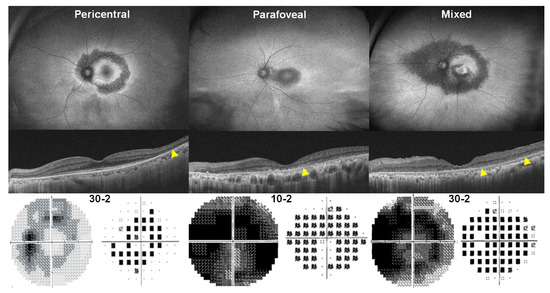 Illustration of typical cases demonstrating pericentral, parafoveal, and mixed patterns of hydroxychloroquine retinopathy in 63-, 69-, and 65-year-old Korean women who have been taking hydroxychloroquine for 7, 24, and 20 years, respectively. Top: fundus autofluorescence images; middle: optical coherence tomography (OCT) scans; bottom: grayscale (left) and pattern deviation (right) plots of Humphrey visual fields. Yellow arrowheads indicate outer retinal defects on OCT in the areas of damage (parafoveal, pericentral, or mixed).