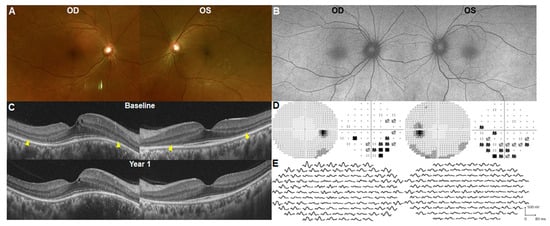 A 44-year-old Korean woman, weighing 56 kg, underwent baseline HCQ retinopathy screening. She had received 300 mg HCQ daily for 6 months for rheumatoid arthritis (RA) and reported progressive loss of peripheral visual field and light flashes for 1 month. She had no other medical conditions except for rheumatic disease, and her family history did not indicate retinal diseases. The initial systemic workup by the rheumatologist was unremarkable. Her BCVA was 20/20 in both eyes and slit-lamp examination revealed no abnormalities. Dilated fundus examination and FAF (Figure 2A,B) showed a normal retina. However, OCT revealed photoreceptor loss in the paracentral areas of both eyes (Figure 2C). The 30-2 strategy of automated perimetry identified paracentral scotomas in both eyes (Figure 2D). Multifocal ERG demonstrated a generalized depression of amplitude and delayed latency in the paracentral area (Figure 2E). Discontinuation of the drug did not cause further progression of symptoms or damage to the photoreceptor over 1 year (Figure 2C, bottom). The early onset of disease within 1 year of HCQ use was noted in only one (1.1%) out of 95 patients.