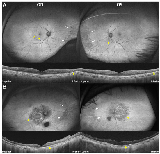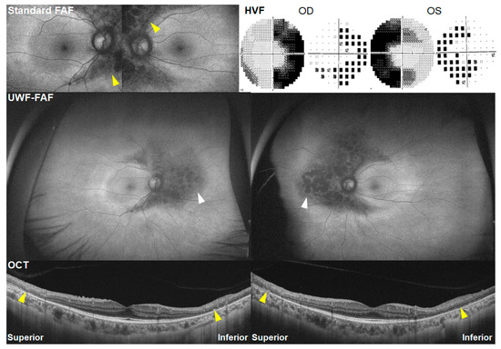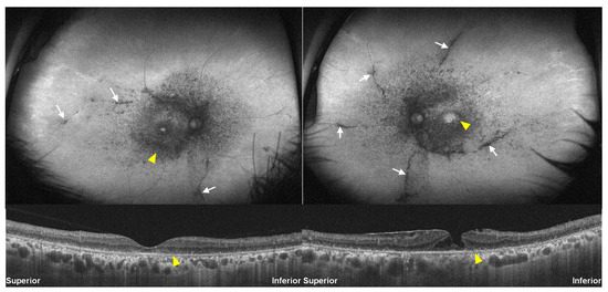 Fundus autofluorescence (top) and optical coherence tomography images (bottom) of Case 4 with perivascular involvement, which is more prominent in the left eye. Yellow arrowheads indicate characteristic (parafoveal or pericentral) damage, whereas white arrows indicate perivascular hypo-autofluorescence.