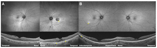 Fundus autofluorescence (top) and optical coherence tomography images (bottom) in two patients (A [Case 6] and B) with unilateral involvement of retinopathy. Yellow arrowheads indicate characteristic (parafoveal or pericentral) damage.