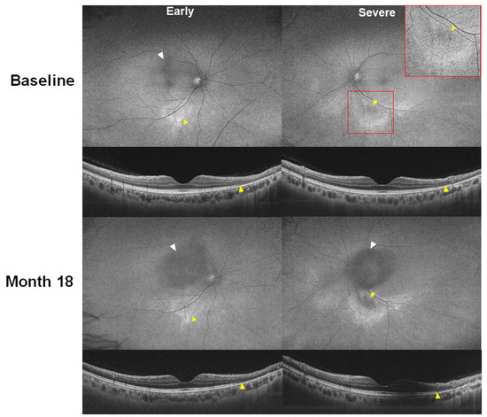 Fundus autofluorescence (FAF; top) and optical coherence tomography (OCT; bottom) images of Case 7 with asymmetric involvement of retinopathy severity at baseline and 18-month follow-up visits. The right eye shows localized hyper-autofluorescence on FAF and localized photoreceptor loss on OCT (both indicated by yellow arrowheads), indicating early retinopathy. The left eye demonstrates mild hypo-autofluorescence, more distinguishable in the magnified image (inset in the upper right corner), and localized outer retinal defects on OCT (yellow arrowheads). At month 18, the right eye shows no progression, whereas the left eye reveals retinopathy progression with more extensive photoreceptor loss on OCT and definite hypo-autofluorescence on FAF (both indicated by yellow arrowheads). White arrowheads indicate artifacts due to cataract progression.
