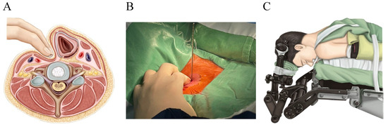 (A,B) The two-finger technique is shown above, with (A) a drawing of the technique on the left and (B) a photo of the technique being performed on the right. (C) Prone position with the neck slightly flexed, and the head fixed in the Mayfield head clamp.