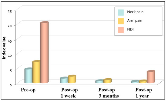 Mean visual analogue scale (VAS) scores for neck pain and arm pain, and Neck Disability Index. NDI = Neck Disability Index, pre-op = preoperative, post-op = postoperative. One of the 43 patients was lost to follow-up after 3 months postoperative.