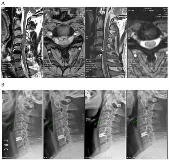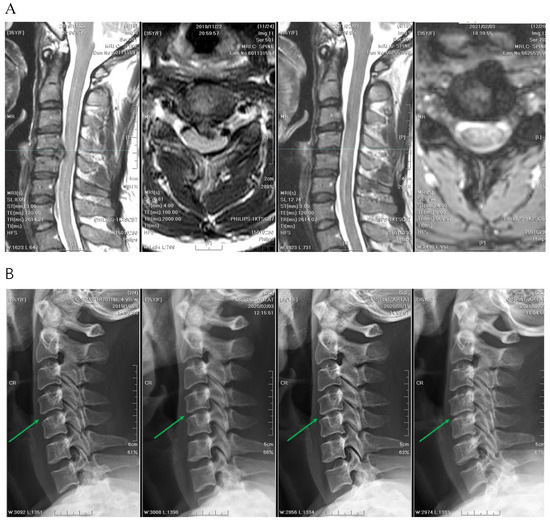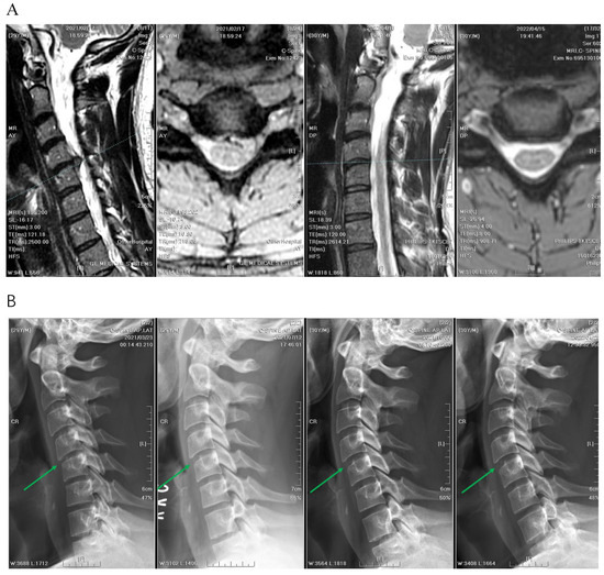(A) The intervertebral disc height of C3–C4 decreased significantly from 5.0 mm to 3.2 mm before and after APECD (MRI before APECD on the left and one year after the surgery on the right). (B) The images from left to right are radiographs before APECD and 3 months, 6 months, and 1 year after the surgery. Green arrows point to the C3–C4 disc space. The reduction of disc height of C3–C4 was sufficient to be observed by the naked eye.