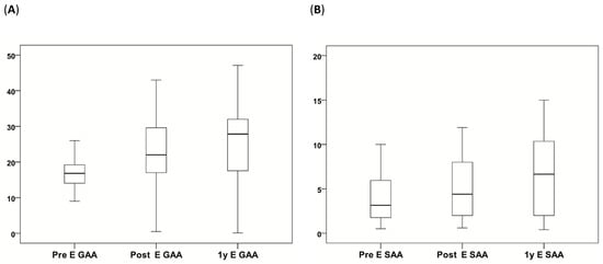 (A,B) The box plot displays the significant difference in E GAA and E SAA, as indicated in Table 4.
