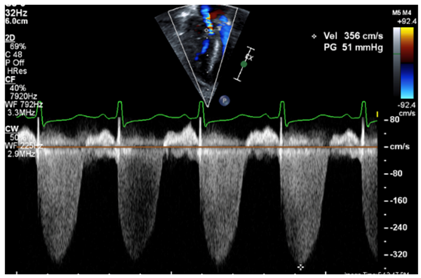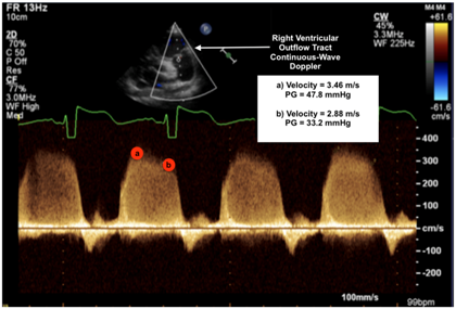 | Legend: Mean pulmonary arterial pressure (mPAP): Peak/early diastolic velocity estimates the PA–RV (pulmonary artery to right ventricle) gradient in early diastole to be 32.59 mmHg using the modified Bernoulli equation (4 × velocity2). As such, mPAP is estimated as 47.8 mmHg (4 × 3.462) + expected right atrial (RA) pressure (~5 mmHg) = 52.8 mmHg [24]. | |