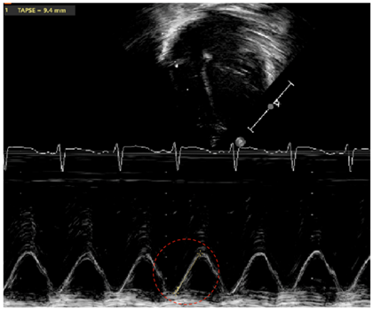 | TAPSE | Tricuspid annular plane systolic excursion (TAPSE) is a marker evaluating RV systolic function using the M-Mode tracking motion of the tricuspid valve (line of interrogation crossing the apex and attachment of the tricuspid valve to the RV-free wall). It estimates the longitudinal displacement of the tricuspid valve from peak diastole to peak systole. Low values (by age) indicate RV dysfunction [32,33,34]. |