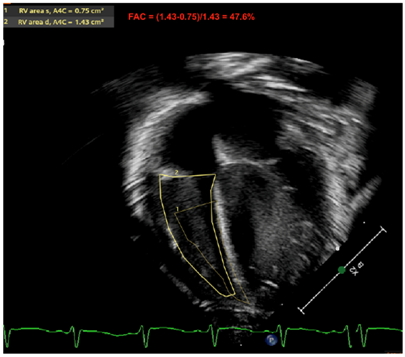 | RV-FAC | FAC is calculated after obtaining the end diastolic (EDA) and the end systolic area (ESA) of the RV (FAC = [EDA − ESA]/EDA), and also provides an important marker of RV function. Normative values have been published (although normal FAC values quoted to be most common when >35%) [35,36,37]. |