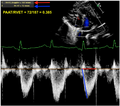 | Pulmonary artery acceleration time/right ventricular ejection time (PAAT/RVET) | This ratio provides some insight on the RV afterload. In a situation where the RV afterload is increased (either due to high pulmonary vascular resistance or other contributors—flow/pressure transmission), this ratio decreases. Ratio is measured from the pulsed wave (PW) Doppler envelope of the right ventricular outflow tract. A low ratio suggests an increased pulmonary afterload (abnormal < 0.31; some use a cutoff of <0.25) [26,27,28]. |